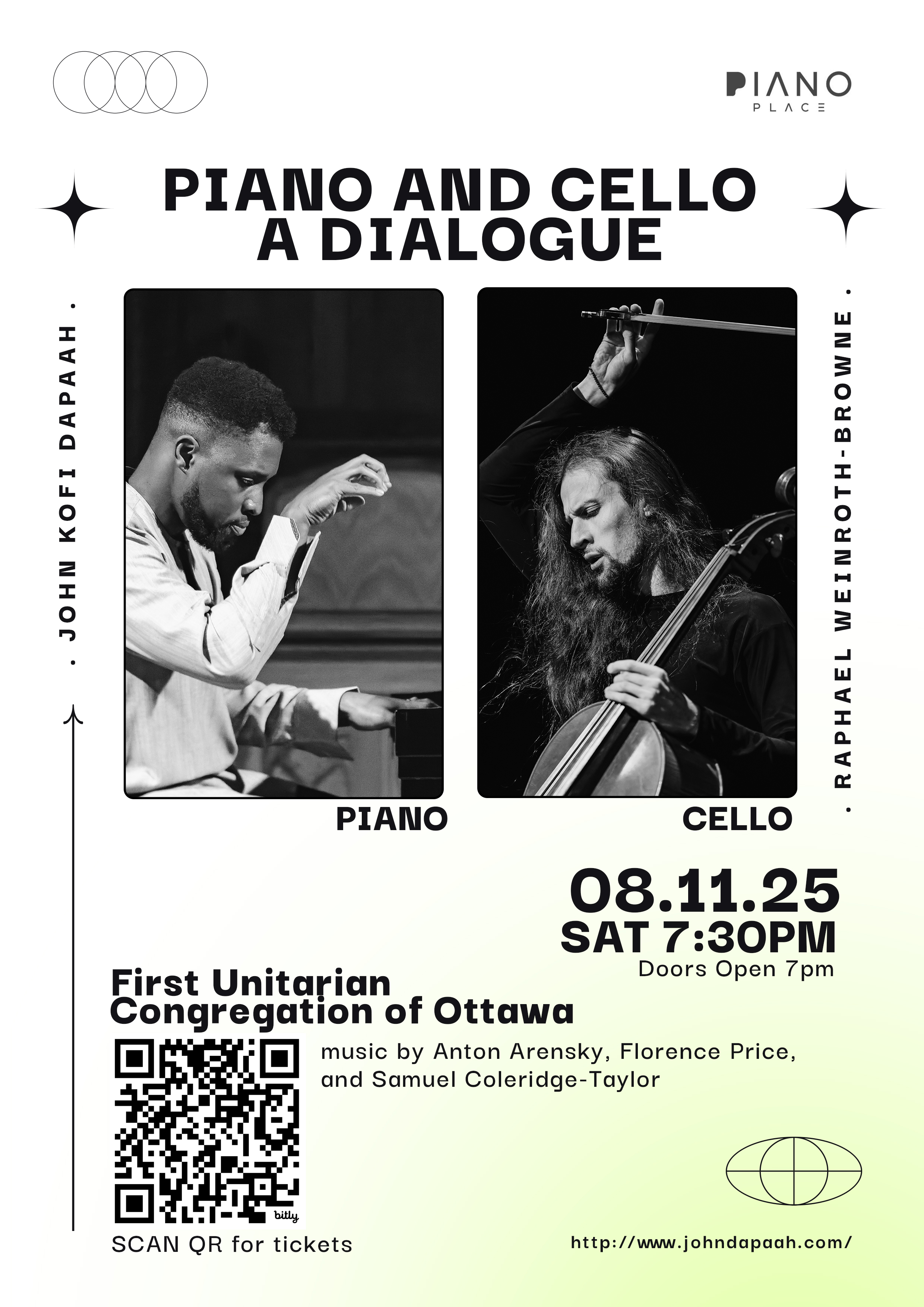 Come join us for a captivating evening of music as the Piano and Cello engage in a beautiful dialogue at the First Unitarian Congregation of Ottawa. Experience the harmonious blend of these two instruments in a serene setting. Let the enchanting melodies by Anton Arensky, Florence Price and Samuel Coleridge-Taylor transport you to a world of tranquility and emotion. Don’t miss this unique musical experience!