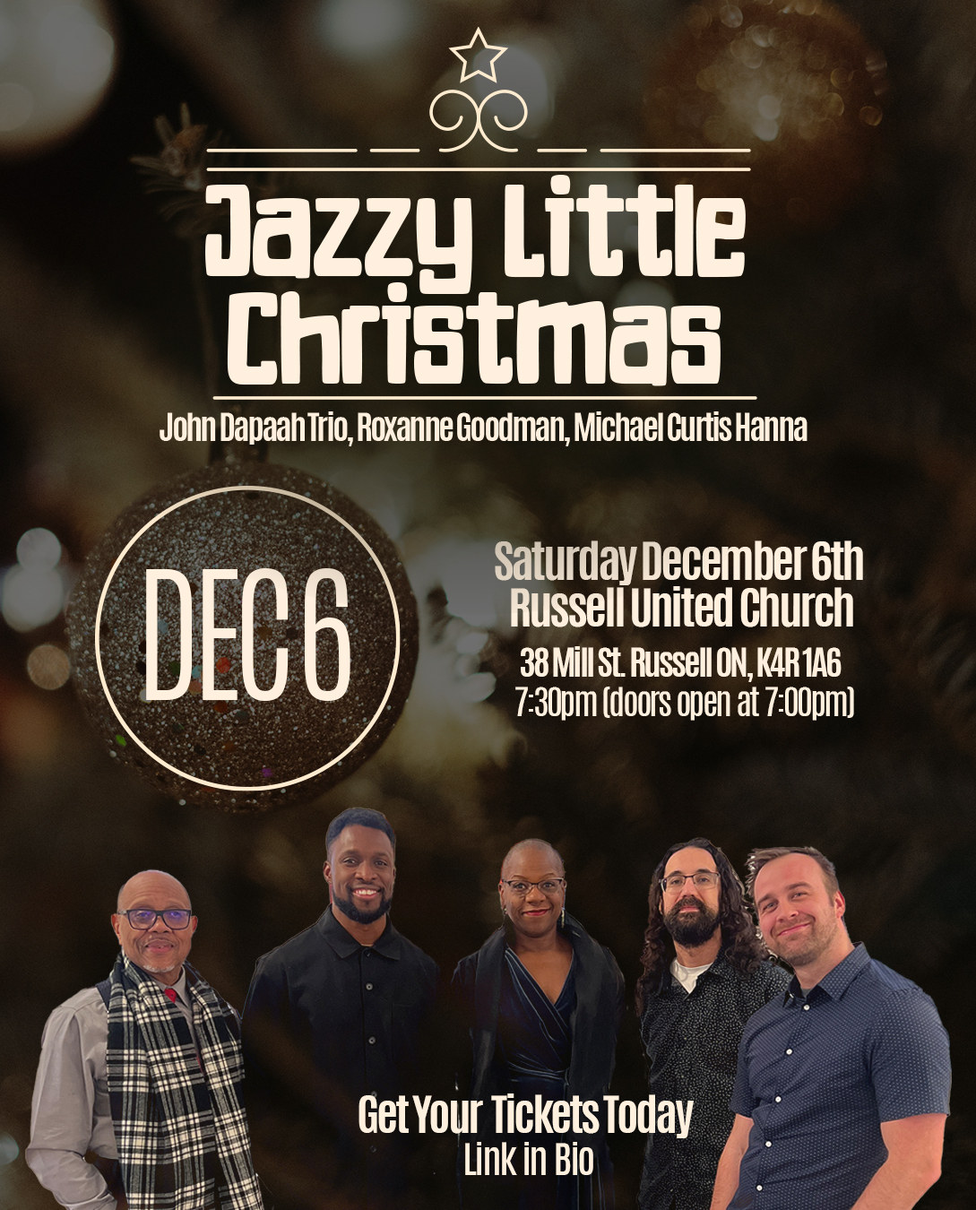 From Chestnuts to Charlie Brown, “Jazzy Little Christmas” is a sparkling program of Yuletide essentials. Superb gospel and jazz, brought to you by Michael Curtis Hanna, Roxanne Goodman and the John Dapaah Trio (Jamie Holmes – drums, JP Lapensée – bass, John Kofi Dapaah – piano)! Join us for a night filled with festive music and holiday cheer at Russell United Church on Saturday December 6, 2025 at 7:30 PM (doors open at 7pm). Get ready to groove to some jazzy Christmas tunes and enjoy a magical evening with friends and family. Don’t miss out on this special event that will surely get you in the holiday spirit. See you there!