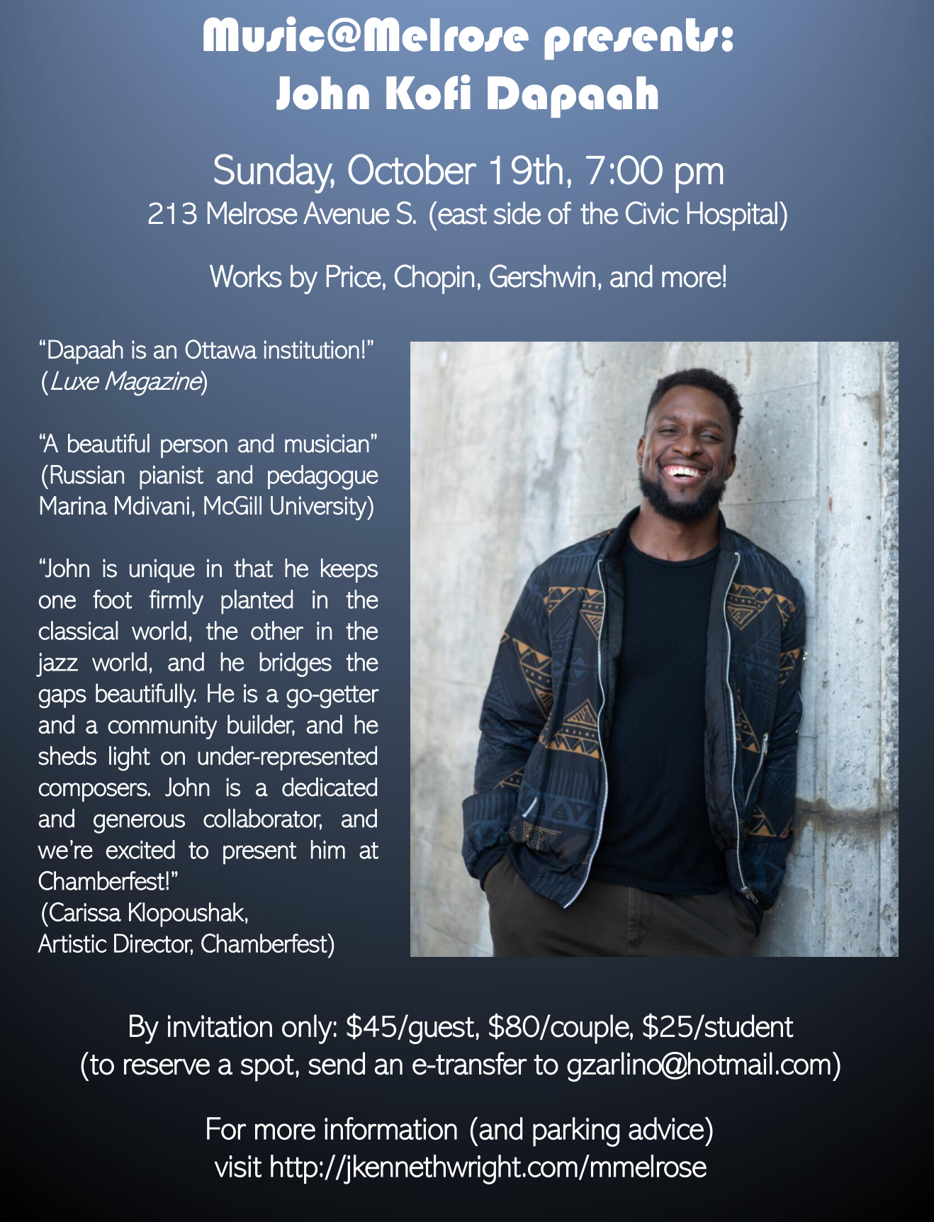 Join me for a private home solo concert and reception in Ottawa, ON. Follow the tickets link for more information